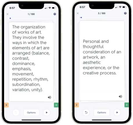 If Callie wants to just review her art definitions, she uses the Flashcards mode. In this mode, she gets to read and review all definitions, shuffle them for randomness and use text to audio to help retain through auditory inputs.