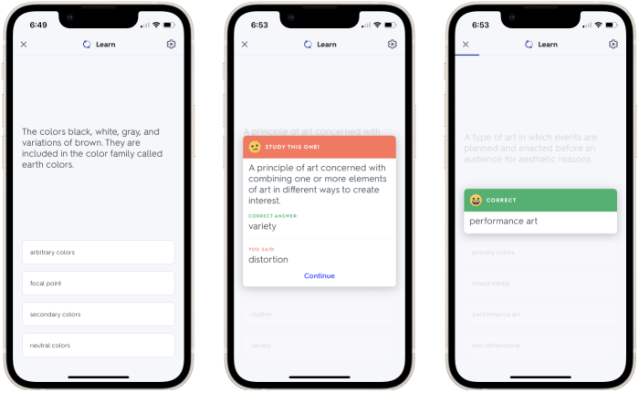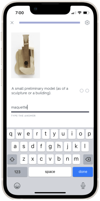 In the Write mode, Callie can spend time reviewing definitions without the help of choices. She inputs the answer and gets a response back. If she inputs the incorrect answer, the app corrects it.