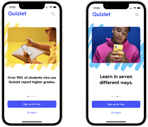 The sign up carousel screens are impactful. The information is focused on the advantages of quizzing and how the experience can be personalized. Quizlet is showing value before sign up and increasing their chances for sign up and retention.